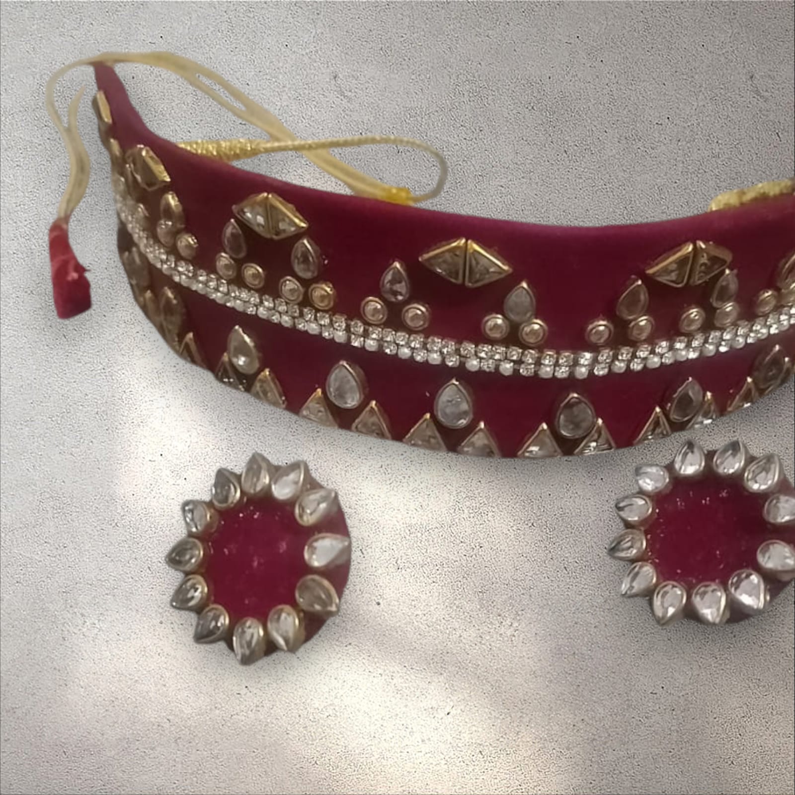 Crafted from premium velvet fabric, the headband is embellished with intricate Kundan stones and mirror work, reflecting the richness of traditional Indian jewelry. The matching patches are designed to complement the headband, offering a cohesive and stunning look. -